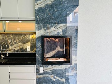 - Área gourmet equipada com ilha iluminada em LED, cooktop, depurador, churrasqueira e armários planejados